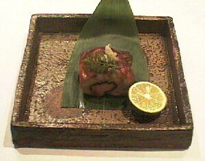 実際には、はらもではなく鮪のオオトロの部分を使っています。オオトロと言っても刺身になるような処ではなく、脂が強すぎる処を味醂づけにしておいたもので、スモークサーモンをすり身にしたものを巻いてあります。焼き上がりに山葵醤油を何回か塗って出来上がりです。