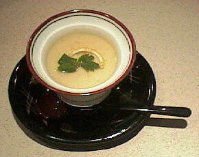 オマール海老や車海老など色々な海老で取ったソース(いわゆるソースアメリケーヌ)を使った茶碗蒸しの中に、オマール海老をほぐしたものや銀杏などを入れて、蒸し上がりには濃いめに取った出汁を使ったあんをかけて召し上がっていただきます。