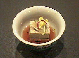 玉子子豆腐のバージョンの中にはいろいろな料理の仕方がありますが、この料理もその中のひとつです。玉子豆腐の中に蟹の身をたっぷりと流し込み、その上に蟹味噌を流してあります。見た目には二段に重ねてありますが、食べていただくときには味がひとつになるようにしてあります。