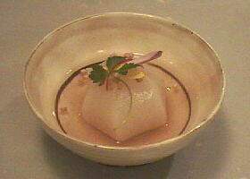 蕪を六法に剥き(六角形のこと)、昆布と鰹のだしでゆっくりとやわらかくなるまで火を通していきます。味付けは薄味で、しかし蕪の味がぼやけたりしないようにしっかりと付けていきます。お客様にお出しする前に濃いめの味のあんをかけ、姫三つ葉や黄色の食用菊などで飾ってお出ししています。蕪自体の持ち味を壊さないように味を付けていかなければいけません。