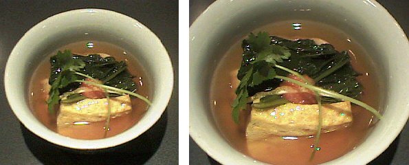 を切った豆腐を裏ごしにかけ、つなぎに山芋、卵白を入れ、さらに味を付けた銀杏、なまふ、京人参、海老、小口に切った卵焼きなどと流しカンに入れて蒸しあげます。お客様にお出しする時は小口に切ってすり下ろした山芋をかけ、濃く取った鰹だし汁に味を付け、あんかけにします。白が葱(ねぎ)と柚子を添えて出来上がり、アツアツが美味しい料理です。
