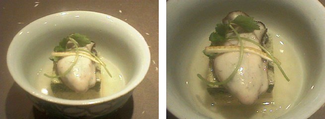 少し濃いめの玉子豆腐に軽く火を通した牡蠣をすり身にしました。牡蠣のワタの部分だけを使って味を濃いめにして、塩・醤油・味醂などで味を調えます。流しかんに流し、火を通した後で小口に切れ分け、お客様にお出しするときには、コンソメスープの中で火を通した牡蠣をのせ、濃く取った鰹だし汁で作った餡を掛けて出来上がりです。