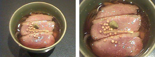 よく戻した蕎麦の実を美味だしに漬け、よく含むませた後で蒸し缶でふっくらとするまで蒸しあげます。蕎麦つゆに追い鰹をした後、葛(くず)で餡を引き、器に盛った蕎麦の実の上に鴨のロースまた甘鯛などの白身魚を蒸しあげたものを乗せ、先ほどの餡をかけて出来上がりです。