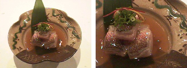 さて、今月の料理の説明ですが、素晴らしく鮮度のよい甘鯛を小口に切り分け、さっと湯ぶりをします。氷水でよく冷やして、器に盛り付け、冷たいポン酢餡をかけて出来上がりです。さっぱりとしていて口の中に入れると甘鯛の「もちもち」した感触が楽しめます。甘鯛の上に少しワサビを載せて召し上がってください。