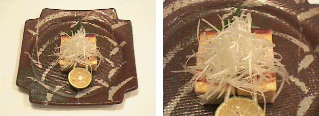 この料理に使う伊達巻きは巻かずにそのまま焼き上げるので、伊達焼きと呼びます。伊達焼きと伊達焼きの間に、海老のすり身とたっぷりのさらしねぎを混ぜたものを挟み、蒸し上げます。お客さまに出すときには、小口に切り分け焼き串を打ち、あまり玉子の色が飛ばないように火を通し、焼き上がりに大根卸しに醤油をかけたものをたっぷりと添えてでき上がりです。