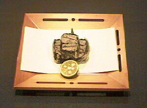 としおにして一晩おいた太刀魚と烏賊(イカ)のすり身を交互に重ね合わせた物を、一度蒸して火を通しておきます。小口に切り揃えて海苔で巻き、揚げて火を通して完成です。「博多揚げ」という名前は、九州の博多で作っている博多帯の模様に、この料理の切り口が似ているのでこう呼びます。ちなみに料理に使う食材を重ね合わせて、その模様を楽しむような料理のことを博多某といいます。出来上がった料理にハーブを加えた塩をかけて味わっていただきます。烏賊の味と太刀魚の蛋白な味わいが、油で揚げることによって更に引き立ってくる料理です。