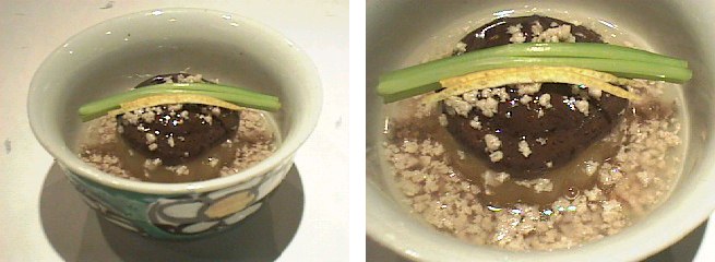 この料理もトマトの冷やし蒸しと同様、この時期の定番メニュ−になりつつあります。とうがんに鶏のそぼろ餡をかけただけの簡単な料理ですが、そのシンプルさが、逆に受けているのではないでしょうか?