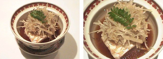 今回の料理はこの甘鯛を使いましたが、季節季節でいろいろな魚に応用がきく料理だと思います。甘鯛の上に千切りにして卵白と混ぜ合わせた馬鈴薯をおき、蒸して火を通す、ただそれだけの料理ですが、これがなかなかいけます。