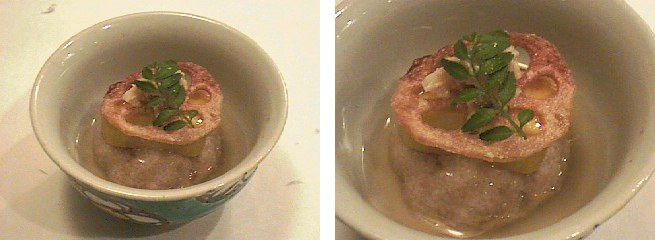 さて、この蓮根の旬はいつかと言うと、11月から3月の間、早出しの新蓮根は7月下旬から市場に出回り始めます。10月の料理に蓮根を使うのは少し変な感じもしますが、これから出てくる百合根のつなぎのつもりで作ってみました。摩り下ろした蓮根に道明寺を混ぜて(三分の一ぐらいの量)、塩、醤油、味醂、ほんの少しの胡椒、で味を付けておきます。丸く、饅頭のように形を取ったあとで器に盛り込み蒸し器で火を通します。こんがりと焼いた粟麩を饅頭の上において、さらに味のアクセントに山葵漬けを置き、その上から生姜餡をかければ出来上りです。女性のお客様には結構人気のあるメニューです。
