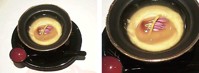 正直言って、毎年茶碗蒸の味付けを変えていくのは、なかなか大変なものです。今年の茶碗蒸の味附けは、胡麻と栗が主体になっています。練り胡麻を卵の出し汁の中に溶かし込んで味を調え、銀杏、椎茸、蟹の身などを入れて蒸し上げておきます。蒸し上がった茶碗蒸の上に、栗を裏ごしして餡状にしたものをかけて出来上がりです。茶碗蒸自体はいくら味付けを変えてみた所で、なかなか別の料理にはなってくれる事のない物ですから、あまり出しゃばる事のない様に心がけています。今年の11月〜来年の1月はこの茶碗蒸で行きたいと思っています。