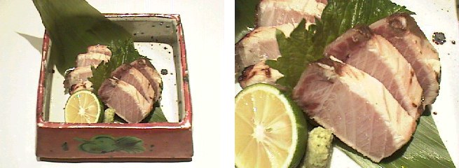 さて、この鰤を節におろしたあとで、醤油に軽く漬けておきます(ほんの十分ぐらい)。その後で串を打って火で軽くあぶって行きます。実に簡単ですが、鰤独特の油が落ちてさっぱりとした感じになり、鰤の刺身が苦手な方にも充分に召し上がって頂けます。紅葉卸とポン酢、ワサビ醤油、どちらでも行けますが、ポン酢のほうがさっぱりとした感じになると思います。