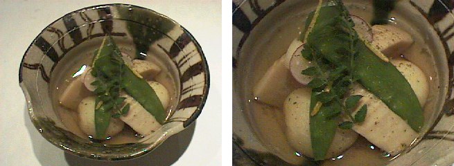 「竹の子と新じゃが芋の煮物」を撮った後、「採れたての竹の子を、ちょうどぬかでアク抜きをしたところだから、新鮮で焼いて食べてもおいしいよ!」と、親方が竹の子を焼いてくれました。ちょっぴり山椒がかけてあり、香りと歯ごたえがたまらない、春の足音を感じる味でした。やっぱり、通いつづけるものですね。メニューにない料理を食べさせてもらえると、ちょっぴり得した気分です。ご馳走さまでした。<Nojee>