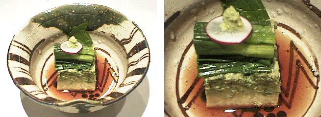 玉子豆腐をベースに(去年、そら豆の豆腐というのを作りましたが、その変形です)ジュウサーによくかけたわけぎを流し込み、蒸し器で火にかけていきます。最初の7分間だけが強火で、後は蒸しあがるまで極力弱火で火にかけます。出来上がりは上の方が緑色の大変にきれいな豆腐になります。冷めた所で、適当な大きさに切り分け、そばつゆぐらいの味のたれをかけて、お客様にお出ししています。飾りとして、茹でたわけぎを少しきって豆腐の上にのせ、ラディッシュをまるくきりワサビを載せてみるときれいです。