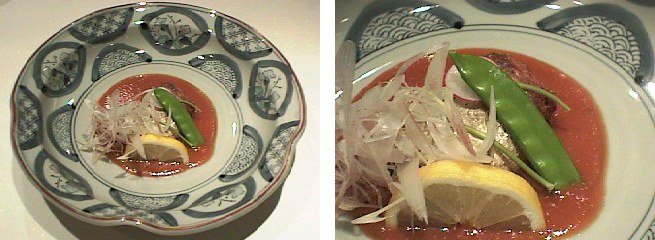 簡単な料理ですが、女性のお客様には大変に好評で、小鯛が出てくるとかならず作らなければいけない料理になっています。小鯛は、いろいろな使い方のできる魚で、私はたいへん好きな魚です。蒸して良し、焼いて良し、揚げて良しと、使い勝っての良いところが気に入っています。鯛科の魚全般にいえる事だと思いますが、味わいが淡白な分だけいろいろと味付けを工夫する事ができます。何もしなくても、もちろん美味しい魚(鯛)ですが、逆に味をつけても美味しくなる魚だと思います。いろいろとアレンジの効く料理なので、ほかの魚でも試してみると面白いと思います。