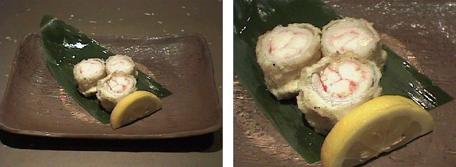 遠州灘でもかなり大型の「太刀魚」が取れてくるようになりました。今回は、この太刀魚を使って揚げ物を作ってみました。太刀魚のように淡白な魚は、そのまま天ぷらにしても十分に美味しくいただけますが、今回は蟹の身を巻いてみました。太刀魚を三枚に下ろして表の方(銀色になっている方の事)に刻みをいれるように包丁を入れていきます。これは後で蟹を巻いて揚げたときに太刀魚の身が縮んで開いてしまわないようにするためです。この太刀魚で蟹の身(俗にカニ足と呼ばれている、棒状になった足の身の部分を使います)を巻き込んでいき、巻きおわったら海苔でさらに巻き、太刀魚が開かないようにします。これに天ぷらの衣を着けて油で揚げていきます。三等分ぐらいの輪切りにして、天つゆ、もしくは塩でいただいてみてください。見た目にも切り口がきれいですし、太刀魚が淡白なためあまりお腹にもたまりません。付け合わせにシシトウなどを添えてみるのもいいでしょう。