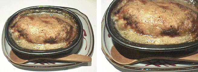 八丁味噌を1に対して、西京味噌を2、そして味噌と同量の鶏の挽肉を混ぜ合わせて作ります。まず鍋に八丁味噌と西京味噌を入れ、酒で伸ばし、弱火にかけていきます。この時よく練り込んで行かないと「だま」ができてしまうので、大変ですがしっかりと練っていきます。火が通ってきたら、鶏の挽肉を入れますがこの時も挽肉を入れたらすぐにしっかりと練っていかないと、鶏肉が「だま」になって固まってしまいます。弱火にかけながら1時間ほど全体に火が通るまでしっかりと練ってください。鶏の挽肉から油が出てきて、味噌が柔らかく、グツグツといってきたら完成です。ほんの少量の砂糖と、みりん、醤油で味をしめます。この味噌をグラタン皿に盛り付けた牡蠣の上におき、とろけるチーズを載せてオーブンで火を通せば出来上がりです。熱々のところを召し上がっていただきたい料理です。
