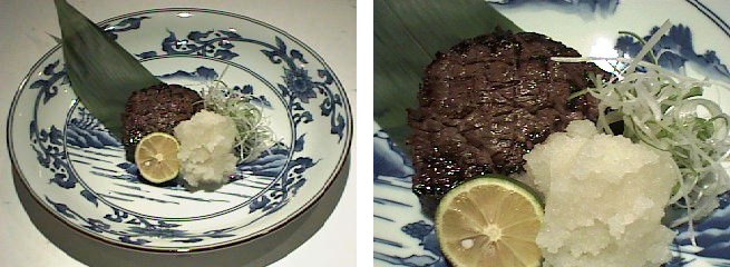 ダチョウを小口に切り分けて生姜醤油で軽く洗い、網焼きにします。「まるで牛肉のようだ」とほとんどのお客様が言います。焼き上げたダチョウを食べやすい大きさに切り分けて器に盛り付ければ完成です。鶏や牛の骨でスープを取り、その中につけておくと、浸透圧の関係でダチョウの中の水分や血が出て行き、かわりにスープが染み込んでいきます。