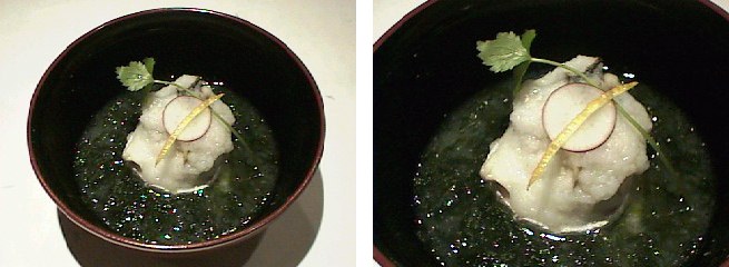 まず始めに、三枚下ろした太刀魚で小さな輪を作っておき、これを火に通して形が崩れないようにしておきます。次に、この輪を器に盛り付けておき、味付けをした出し汁の中で火を通した牡蠣を2かんほどおきます。これを蒸し缶の中に入れ、山芋をかけて蒸し上げます。新海苔と大根おろしを一緒にだしの中に入れ、火にかけます。少しトロミが出て来たところで味を付け、蒸し上がった牡蠣の上にかければ出来上がりです。柚などを添えて香りをつけると一層美味しく召し上がれます。