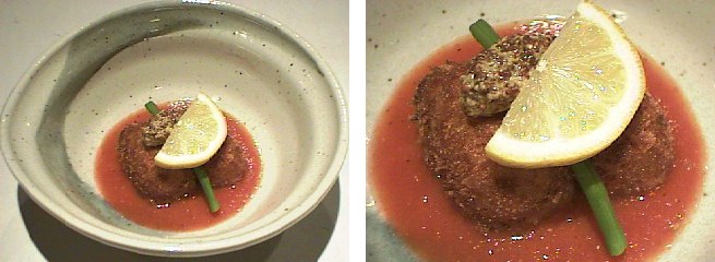 先月は、蟹クリームコロッケ99を作りましたが、今月はそのコロッケを少し改良して新しい物を作ってみました。貴田乃瀬はごまを使った料理を何種類か作ってきましたが、白ごまを使ったこのコロッケは自信作(黒ごまの黒豚煮も自信がありましたけど)です。ホワイトソースの色を壊さないように白を選びましたが黒ごまを使って真っ黒のコロッケなんて言 うのも面白いかもしれませんね。コロッケに使うソースはトマトをベースに、ソースアメリケーヌを合わせて作りましたが、 トマトケチャップなどでも美味しいかもしれません。