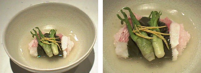 白身魚に桜の葉、薄く桃色に色をつけた道明寺、これだけでも結構美味しそうな料理が 浮か んできます。白い器の中にこれらの材料を盛りこみ、蒸し器で軽く火を入れていきます。 濃くとったかつお節の出汁に味をつけ餡にします。蒸し上がった材料の上からたっぷりとかけて召し上がって頂けば完成です。簡単な料理に見えますが、取り合わせが決め手になってきます。塩漬けにした桜の葉の味が、白身魚にほんのりとした味付けをします。薄桃色に染めた道明寺が出汁をすって甘くなっています。こんな料理が毎月続くと嬉しいですね。