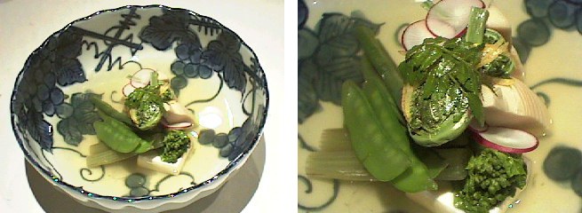 たっぷりの出し汁でたき上げた「竹の子」と野菜の取り合わせ。 春の味わいの一品 です。 朝堀の柔らかい竹の子をつかい、ゆっくりを味を染み込ませていきます。 取 り合わせの野菜には「春」を感じさせるものを用意しておきます。 菜の花、天豆(少 し早いかな)、京人参でいろをそえ、木の芽をあしらっておきます。 春を感じる野菜 の炊き合わせ。