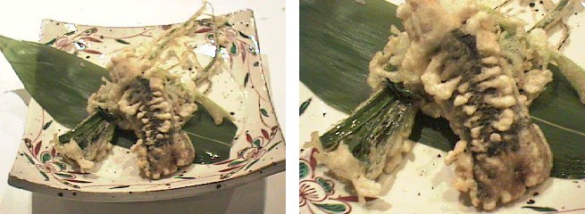 今回は、この鮎を使って面白い料理を考えてみました。鮎の内臓を使った塩辛を「ウルカ」とい言います。このウルカを(内臓を)何かに使えないかと思い、塩味の変わりにしてみました。鮎を3枚におろします。このとき、内臓はつぶさないように取り出しておき、薄く塩を振っておきます。6時間ほどして鮎の内臓(ウルカ)から味が出てきたら、先ほど3枚に卸した鮎で両側から包みこみます。海苔を帯代わりにして「ウルカ」と鮎がバラバラにならないようにしておきます。これを天ぷらに揚げるのです。からりと揚がった所で、生姜を聞かせた天汁で召し上がってください。「ウルカ」の塩味がきいたナントも言えない味わいの変わった天ぷらの出来あがりです。