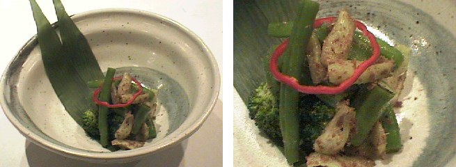 アンチョビーをフライパンにあけ、弱火でほぐすようにしていきます。中に入っていたオリーブオイルがフライパンの上でなくなり、アンチョビーがそぼろのような状態になってきたら、ニンニク、生姜、鰹節を加え、さらにじっくりとそぼろを作っていきます。完全に水分が無くなったら新聞紙の上にあけ、さらに水分を飛ばします。茹でたつる菜を適当に刻んで、このアンチョビーのそぼろをかけ、まぶしてお客様におだしします。はし休めぐらいにちょうど良いかもしれません。