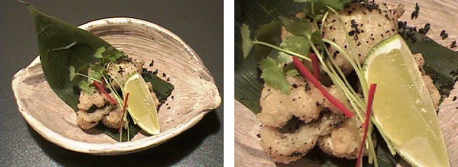 山椒を使った料理の二つ目ですが、今度は揚げ物に使ってみました。山椒は「白身魚の山椒まぶし」に使った物と同じ物を使います。鱧(ハモ)はしっかりと骨切りをし、くず粉を打ち、軽く湯通しをしておきます。水気をふき取ってから、冷蔵庫で少し休ませ、油に入れる前にもう一度水気をふき取ります。揚げる前に軽く片栗粉をふり、180度ぐらいの油で揚げます。ポップコーンのように揚げることができたら、きっと美味しいだろうと思って作ったのですが、なかなかそうはいきません。 しかしサクサクとした感じに揚がって、鱧を揚げた物としては結構面白いと思います。 揚がった鱧に先ほどの山椒をまぶし、塩、胡椒をふりできあがりです。ピリリとした味わいが面白いと好評な一品です。 ビールのお供などに良いと思います。