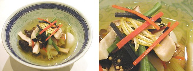 かぶは煮物に蒸し物に汁の実に、そして漬物にと、実にさまざまに使える重宝な野菜の一つです。煮物や蒸し物には甘味のある大型の天王寺かぶ、聖護院かぶなどが良く、漬物などにはこかぶが向いています。調理する時には皮を厚く、硬い繊維が網状になったところまでむく事と、茹でる時には生米を入れるか、米のとぎ汁を使うことがポイントとなります。また、炊くときには、かぶは味をすい込むので最初から味をつけた出汁で追いがつおをして味を整え、煮含めるようにして行くのが良いでしょう。鍋にかぶとキクラゲを入れ出汁を張り、かぶに火を入れます。かぶに火が通ったら、インゲン、エリンギ、京人参、椎茸、白まいたけなどを入れて味をつけます。器に盛り付ける時に、白身魚を小口に切った物を入れ、さっと火を入れてお客様にお出しします。柚子をたっぷりとのせてアラレをほんの少々、女性のお客さまに喜ばれています。