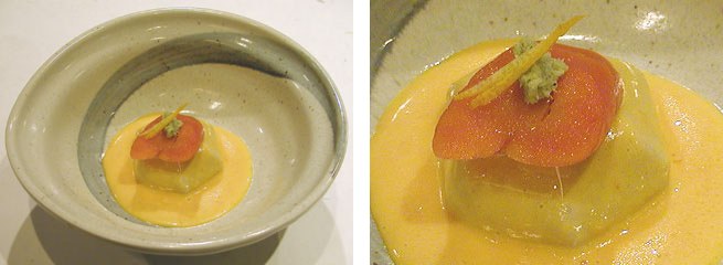 この時期、美味しくなるものの一つにえび芋があります。八つ頭、親芋と呼ばれるもので、含め煮などにすると大変美味しく、芋の特性が生きてきます。この芋を特殊栽培して根の先を曲がらせた物が京都のえび芋で、煮物用に使われています。良く似た芋で京芋(竹の子芋)がありますが、これば曲がらずにまっすぐになっています。今回は、このえび芋を自家製のからすみを合わせてみました。今年のぼらの卵はかなり大きめのものが手に入りました。私のうちのからすみは、燻製にして味を出すという方法を取っていますので、普通のからすみとはチョット味わいが違います。お客さまには大変好評で、こんなからすみもあるんだと喜んで頂いています。このからすみと自家製のマヨネーズを混ぜてねっとりとしたソースを作ります。このソースを含め煮にしたえび芋の上からたっぷりとかけ、さらに小口にきりわけたからすみをのせます。ほくほくとしたえび芋の上にねっとりとしたからすみソースがなんとも言えません。