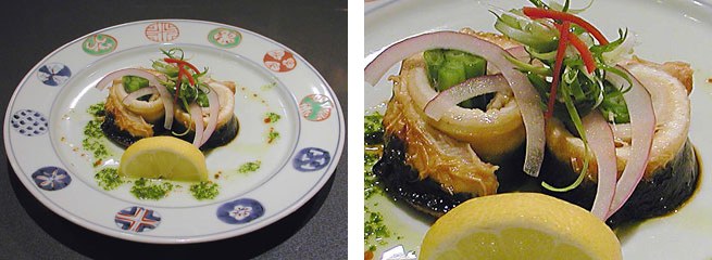 都田川で取れる天然の鰻、その鰻を少し洋風にアレンジしてみました。ネギを鰻で巻き、ほんの少し蒸し上げた後、表面がパリっとするように焼き上げます。フライパンに鰻のタレとオリーブオイル、少量のガーリック、ワインビネガーを加えソースを作ります。これを先ほどの鰻にからめるようにして全体に味をつけて行きます。皿に盛りつける前に半分に切り分けますが、ネギをまいた鰻のグルグルがよく出るように盛りつけます。皿に先ほどのソースを散らすようにかけ、できあがりです。天然鰻は、養殖の鰻よりもさっぱりとしていて、昔から年配のお客様好みと言われています。そこで、少し若い人でも喜んでもらえるように、見た目を洋風に盛りつけられるように工夫してみました。