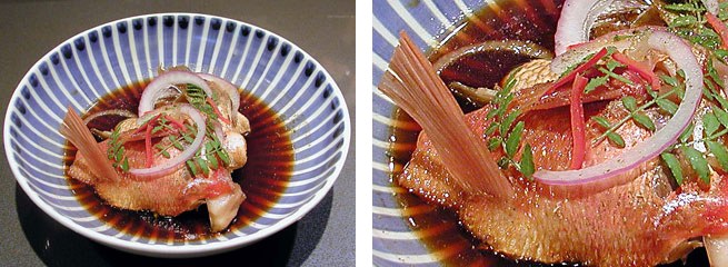 金目鯛(または真鯛)のカマを熱湯で6分程度火を通しておきます。あらかじめ作っておいたタレを沸騰させておき、カマを入れます。本当にサッと火が通ったと思ったら完成です。皿に盛りつけ、粉山椒をタップリと振り、木の芽も多めに盛りつけてお客様に出します。簡単に見える料理です。しかし、サッと煮というくらいですから、あら煮のように味が入る前に火を止めなくてはいけませんし、逆にあまりにもサッとで鯛の皮のゼラチン質の所に味がのる前に火を止めてしまうのもいけません。シンプルな料理ほど、その食材がもっている本来の味わいを壊さないように気を使わないといけません。