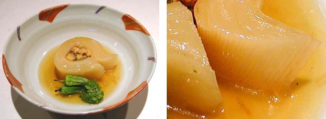 大根をかつらむきにします。かつらむきと言うのは、大根のツマを作るときに大根を紙のようにむいて行く事を言います。板前修業の基本中の基本の仕事です。この紙のようにむいた大根で鰻を巻きこみ、干ぴょうで縛り鍋に入れます。味付けは鰻の味を残し、大根の風味を怖さないように若干薄味にしておきます。箸を入れたときに大根がサックリと切れるくらいの柔らかさにしておくのがコツでしょうか。木の芽を盛りつけ山椒の粉を降りお客さまにおだしします。