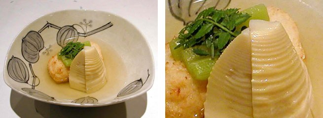 竹の子が出てきました。今年は海老団子と一緒に炊き合わせて見る事にしました。いい竹の子を選び、程よく炊き上げ、玉ねぎをたっぷりと入れた海老団子と一緒にさっと炊き合わせ器に盛りこみます。フキノトウと木の芽を多めに盛りつけて完成です。