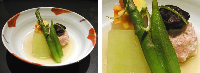 鴨の肉にある特有の臭みを感じさせないように、鳥のひき肉を少し足しています。全く鴨だけと言うわけではありませんから、表示に偽りありかもしれませんね。 まぁ、料理の一味だと思って。鴨の団子からですスープが最高に美味しいので、これを使わない手はありません。野菜は別に炊き上げておきますが、最後に一緒に盛りつけ鴨の美味しいスープをたっ ぷりと入れます。大根をかつら剥きにしたに物が以前評判よかった物ですから、今回鴨と一緒にしてみました。