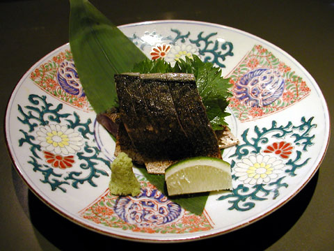思いついてしまいました。サバの塩焼きって美味しいですよねぇ・・サバの皮目をあんなに美味しくするのは塩焼きしかありませんね。で、一工夫と言うかちょっと仕掛けをしてからサバの皮目をバーナーで軽くあぶります。急いで冷まします。きれいに器に盛り付けたらライムとワサビだけで召し上がって頂いています。こんな「シメサバ」見たことないでしょう・・。ただ焼いただけじゃァだめ、ちょっと工夫しないとね。