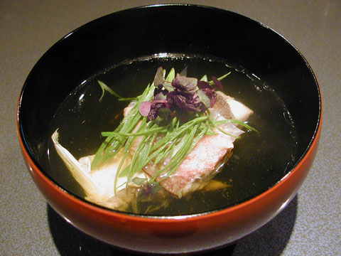 アマダイの頭を使って吸い物を造ります。鰹節の出汁を濃い目にとって、アマダイは沸騰した出汁にサッと入れるくらいで完成です。本来は、アマダイの骨を焼きだしをとったもので吸い物を造るのですが、お酒と一緒って言うわけには行かないようです。で、鰹節の濃い出汁でほんのりとアマダイの味・・・これなら飲んでいる最中の注文でも大丈夫。飲んでいるときには意外と吸い物の注文が多いのです。今まであまり満足のいくようにお答えできていませんでしたが、これではいけないと初心に帰り、吸い物用の器まで買って気合を入れています。