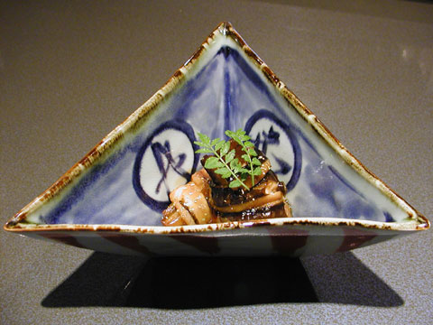 夏になると必ず一品ウナギの料理を作ります。去年は簡単に浜名湖で取れる天然のウナギを白焼きにして(今年もやっていますが)お出ししていましたが、今年も去年と一緒では面白くないと思いまして・・アナゴのごぼう巻きならぬ、ウナギのごぼう巻きを作ってみました。いやぁ、簡単だと思わないで下さい。食べていただければ分かりますが、ごぼうの柔らかさを味わっていただきたいと思います。「えっ、ごぼうってこんなに柔らかかったっけ」と言われるくらいにじっくりと柔らかく炊き上げてあります。壊れてしまわないように、ソオットウナギを巻いていきます。お客様の注文が入ったら鍋で煮あげてお出ししています。山椒を多めに振って食べていただきます。