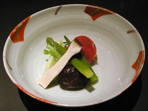 ここ何年か、この冷たい野菜の炊き合わせは、貴田乃瀬の夏の定番になっています。小さめのトマトといろいろな野菜の取り合わせ。夏になると野菜の炊き合わせといいつも困っていて、最終的に冬瓜の鳥そぼろ・・とかに落ち着いてしまうのが嫌で、何とか野菜を「たくさん」・「彩りよく」と考え、出来上がったのがこの料理でした。おかげさまで評判も良く、お店に来てくださったお客様の8割ぐらいの方には注文を頂きます。焼きとうもろこしのしんじょうとこの炊き合わせ、夏の定番ですね。