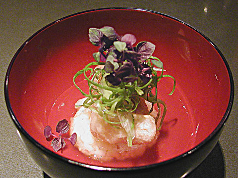 味をつけて蒸したもち米を程よい大きさにまとめておわんに入れます。下味を軽くつけてカリっと揚げた甘鯛をのせ、濃く取ったカツオ出汁に味をつけあんにしてかけます。食べるときにはあまだいを崩してご飯と混ぜながら召し上がっていただきます。