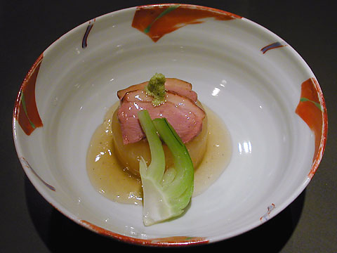 鴨で味をつけた大根には、やはり鴨をスライスして乗せないと格好がつきません。出し汁に葛をひき餡を作ります。たっぷりとかけて柚子をのせたら出来上がりです。