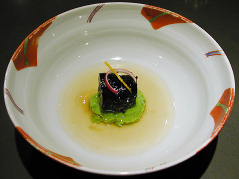 冷まして冷蔵庫に入れておき、お客様から注文があったときにそれなりの大きさに切り分けもう一度蒸し間で蒸しあげ、濃く取ったカツオ出汁に味をつけて少し多めにかけます。下が白い魚の白身で上からかぶさっているものは真っ黒ですから、見た目にはかなりインパクトのある料理に仕上がりました。ゼラチン質の塊のような食感・・。女性のお客様に好評です。
