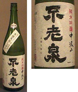文久元年の創業の蔵元。この「不老泉」は、本来この蔵元の「普通酒」についていた銘柄の名前だったのですが、近年、普通酒にはこの蔵元のもう一つの銘柄の名前「奥琵琶湖」を使っており、「不老泉」を吟醸タイプの酒の名前にしています。