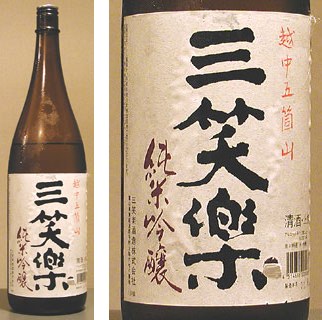 創業は明治13年で、蔵元のあるあたり五箇山でその昔、平家の落人たちが歌った謡曲「三笑楽」と酒は楽しく飲むもの、の意味から酒名がついたそうです。総じてまろやかできれの良い辛口の酒です。
